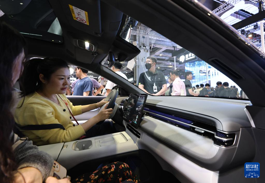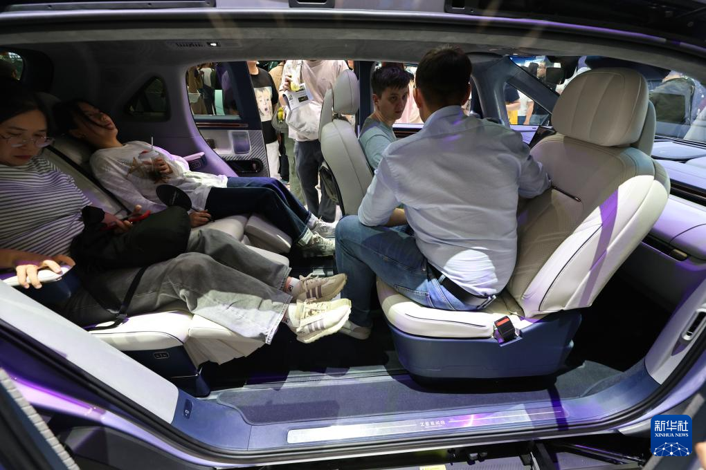 4月26日,参观者在极氪汽车展台体验一款汽车的座椅布局。