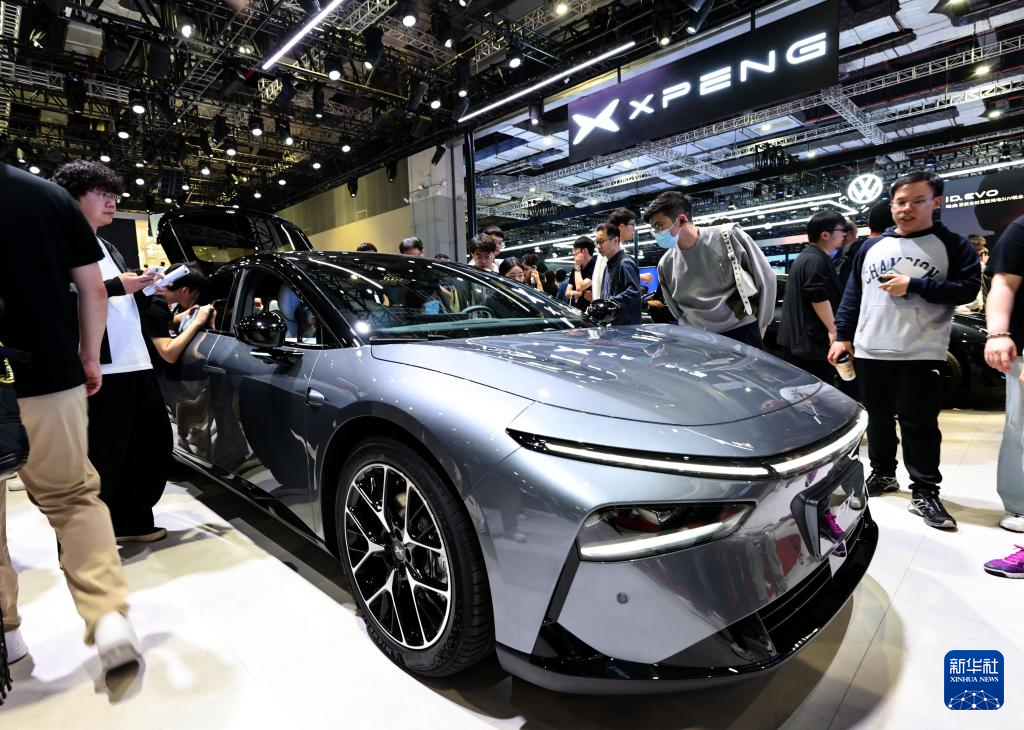 4月26日,参观者在小鹏P7+展车旁观看交流。