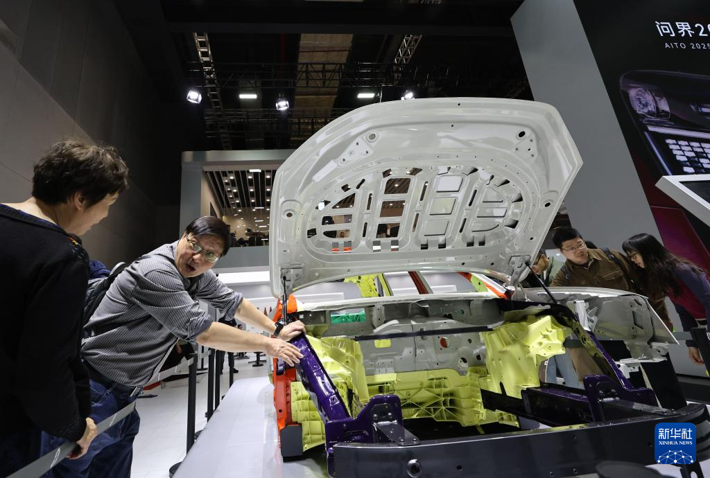 4月26日,参观者在问界汽车展出的一个车身框架前交流讨论。