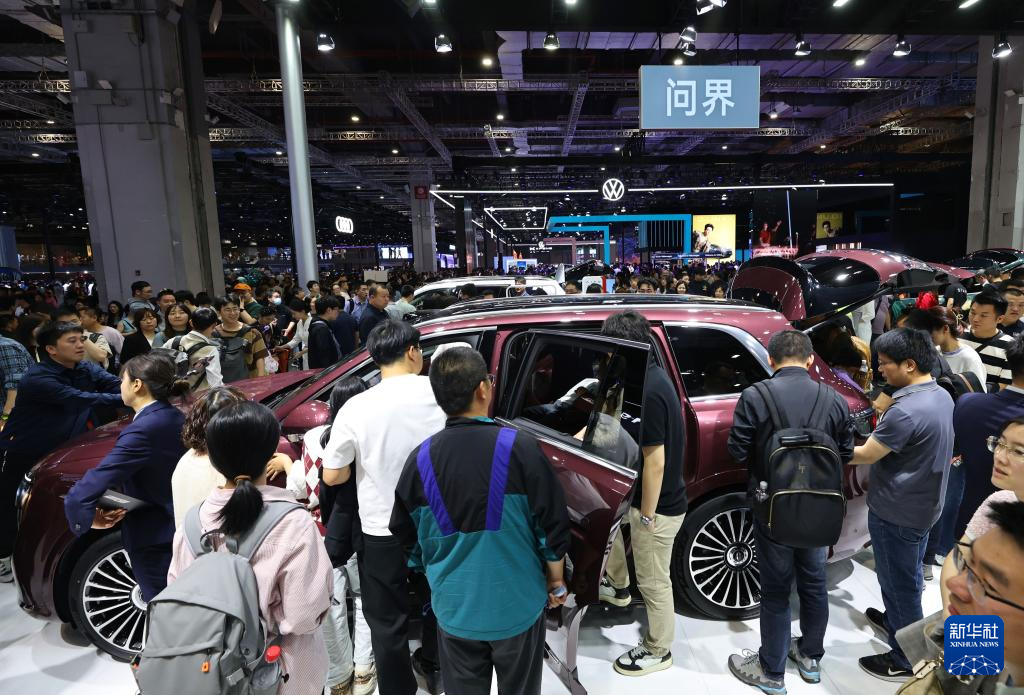 4月26日,参观者在问界M9展车旁参观。