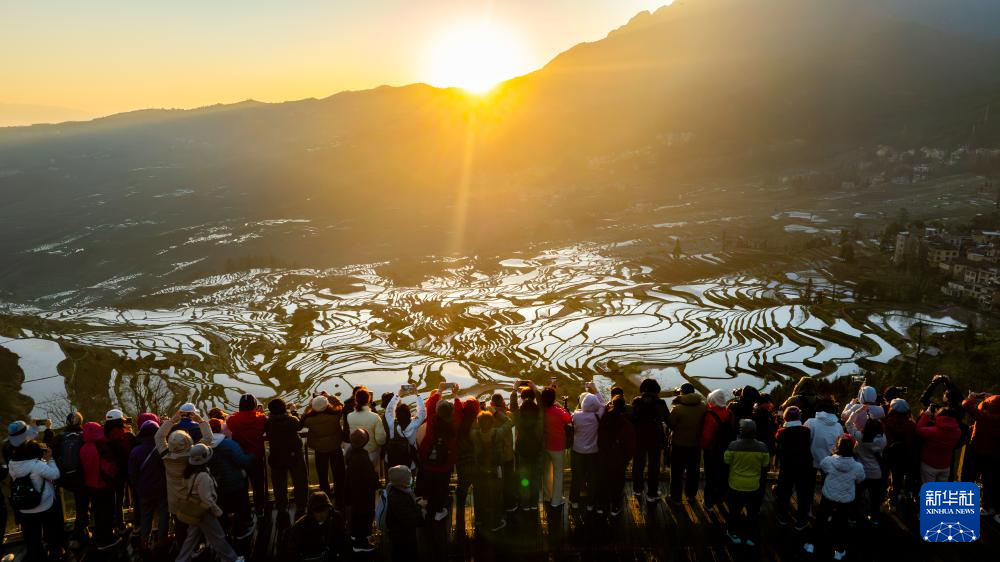 2月28日,在云南省元阳县阿者科村,游客在梯田拍照留影。