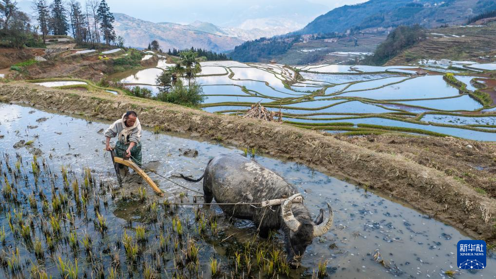 2月26日,在云南省元阳县阿者科村,村民在驱牛犁田(无人机照片)。