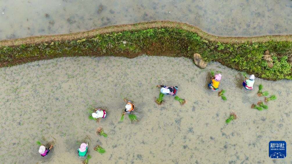 5月2日,在云南省红河县甲寅村,村民在梯田里插秧(无人机照片)。