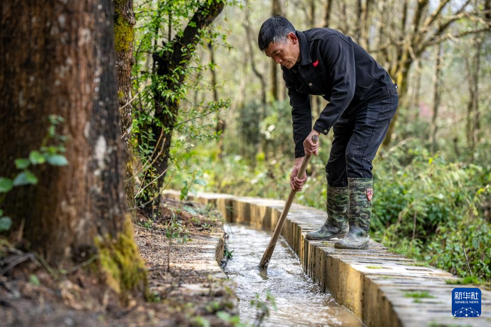 2月26日,在云南省元阳县阿者科村,“赶沟人”高有明在清理水渠中的树叶和垃圾,维系梯田的水源畅通。