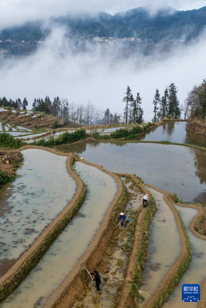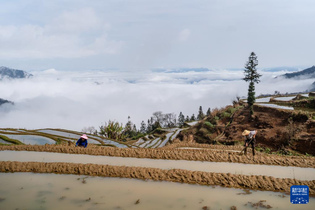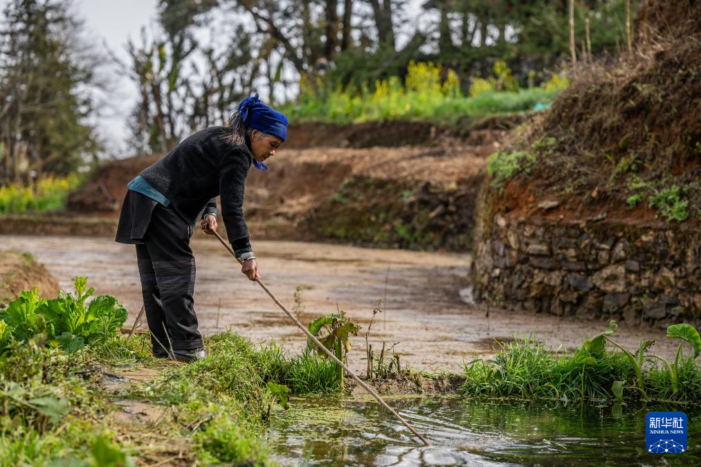2月26日,村民在云南省元阳县阿者科村修筑田埂。
