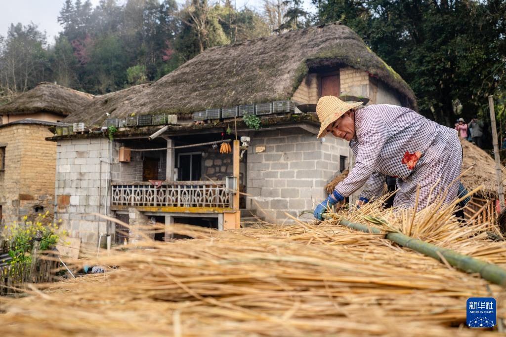 2月26日,在云南省元阳县阿者科村,村民在修缮“蘑菇房”茅草顶。
