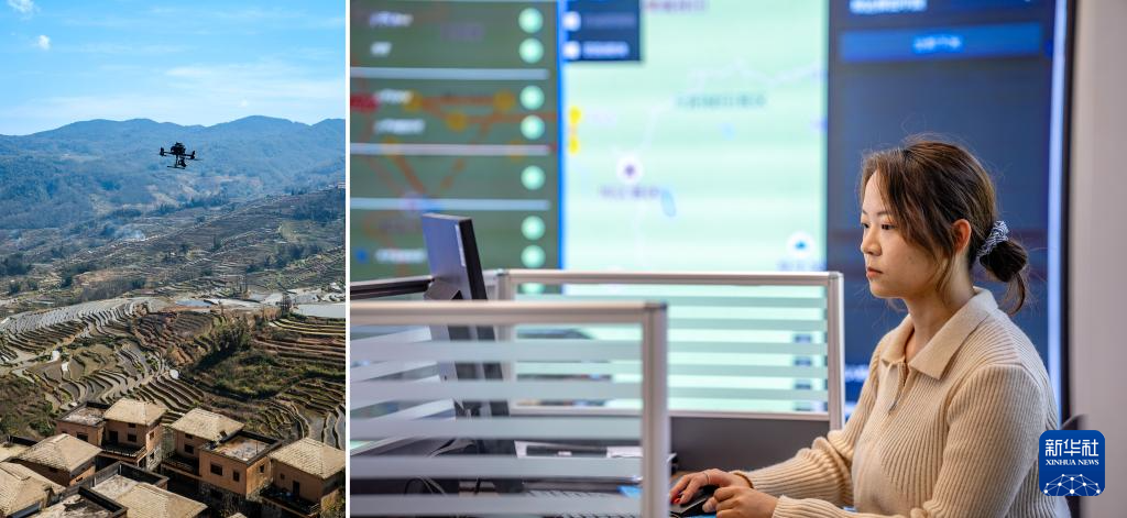 这是一张拼版照片。左图:2月28日,云南省元阳县哈尼小镇的无人机在执行巡视任务(无人机照片);右图:2月28日,红河哈尼梯田世界文化遗产管理局的工作人员陈星宇在控制无人机集群操作系统执行巡视任务。