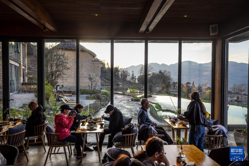 2月27日,在云南省元阳县阿者科村,游客在村民开的民宿餐厅吃晚餐。