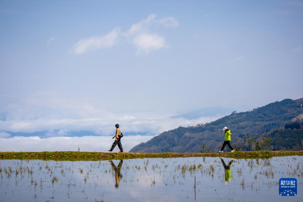 2月26日,游客在云南省元阳县阿者科村的梯田游览。