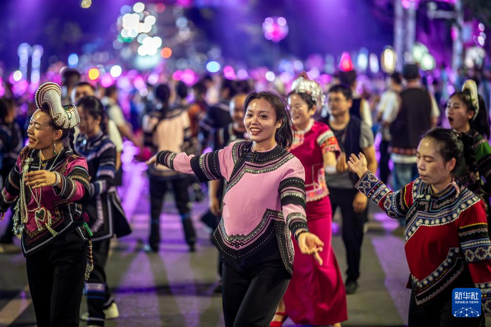 5月1日,在云南省红河县莲花大道,游客和当地群众在参加万人乐作舞会。