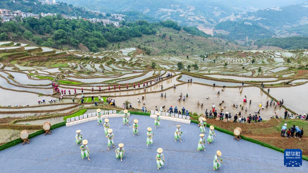 5月2日,在云南省红河县“开秧门”活动现场,演员以梯田为背景表演(无人机照片)。