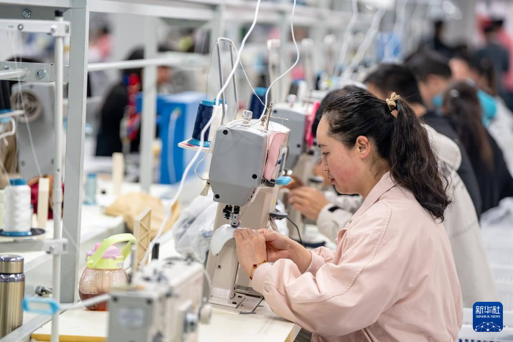 5月13日,云南省昭通市镇雄县居民在镇雄纺织服装产业园鞋服加工车间工作。