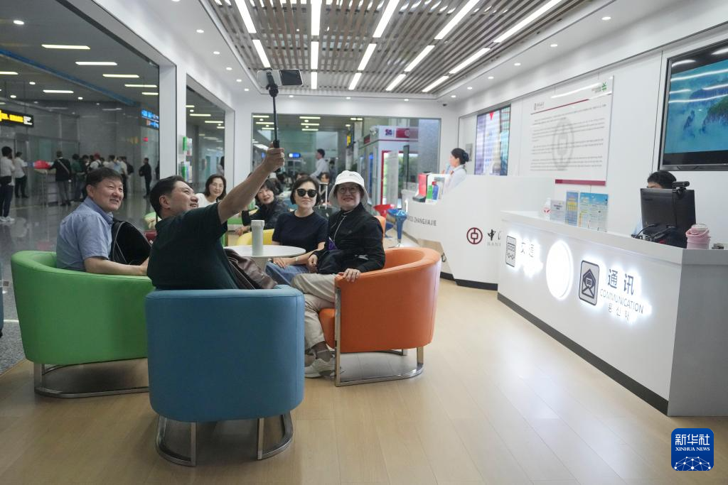 5月20日,韩国游客在张家界荷花国际机场的境外来宾综合服务中心合影。