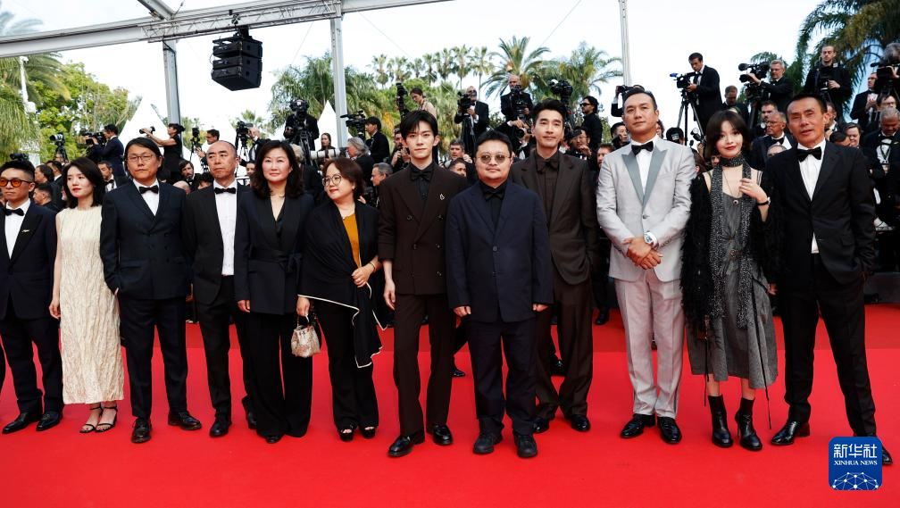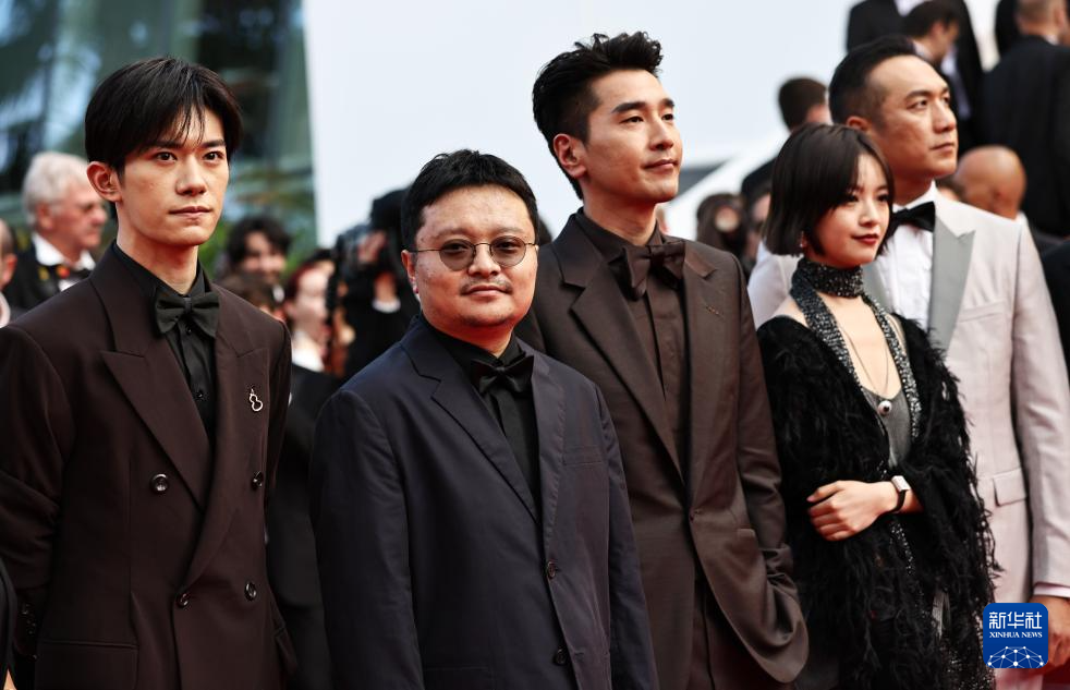 5月24日,在法国南部小城戛纳,中国影片《狂野时代》导演毕赣(右五)携主创人员踏上闭幕式红毯。
