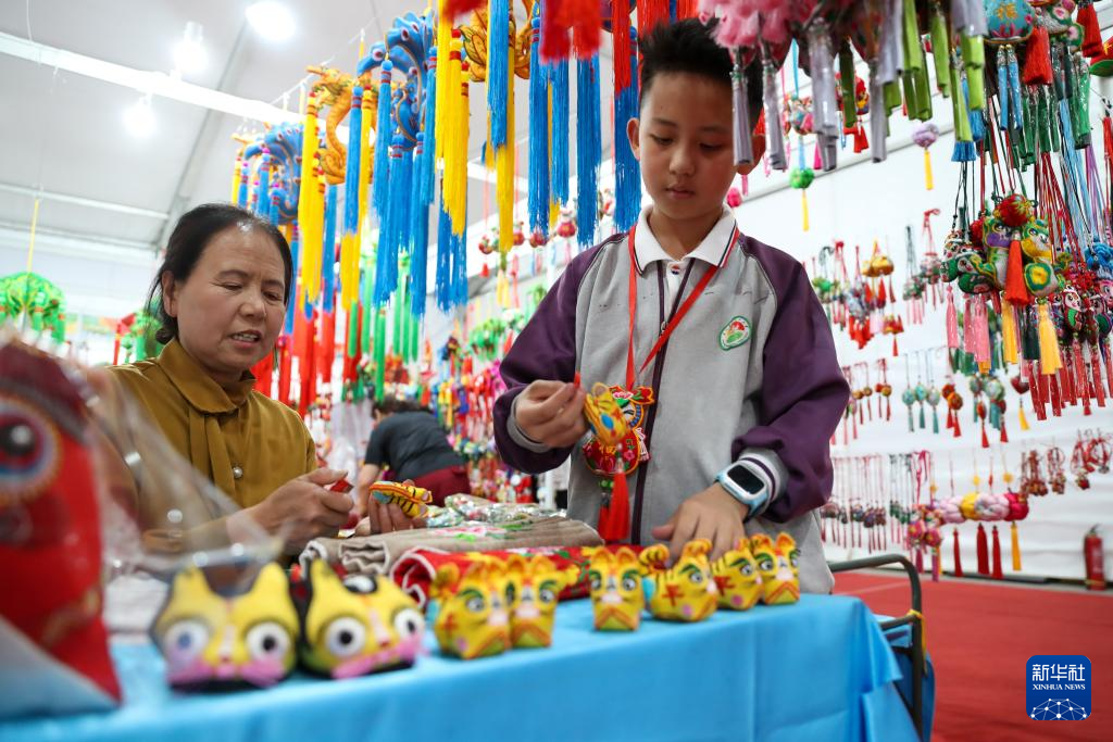 5月29日,在庆阳香包民俗文化节非遗沉浸体验区,一名学生放学后帮忙整理自家摊位上的香包。