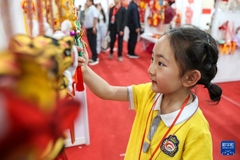5月29日,小朋友在庆阳香包民俗文化节非遗沉浸体验区挑选香包。