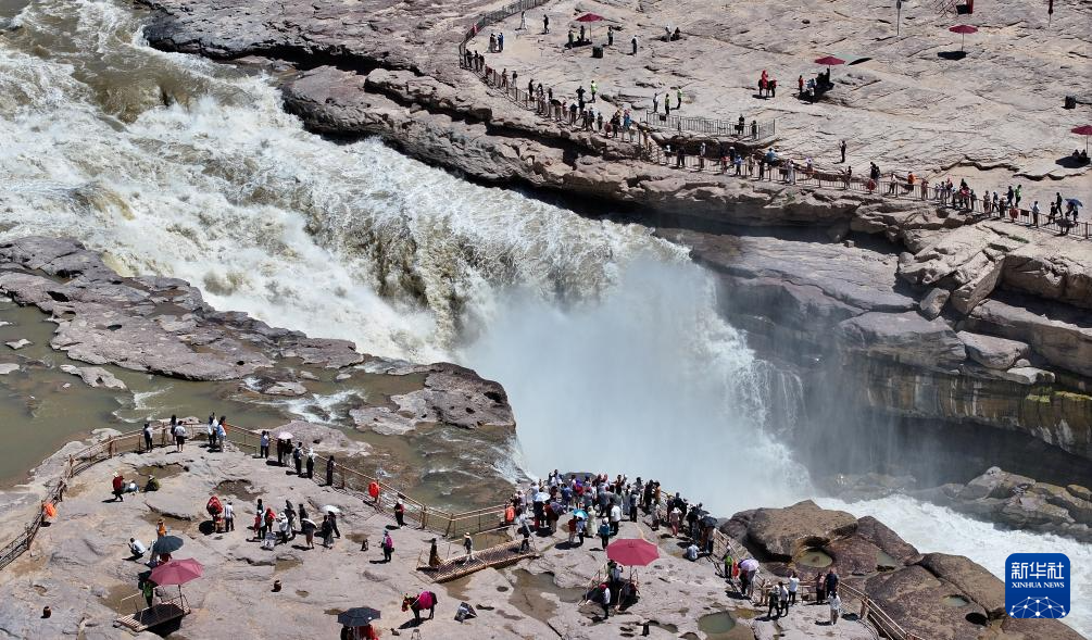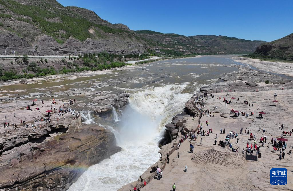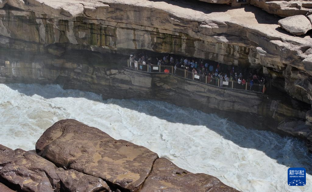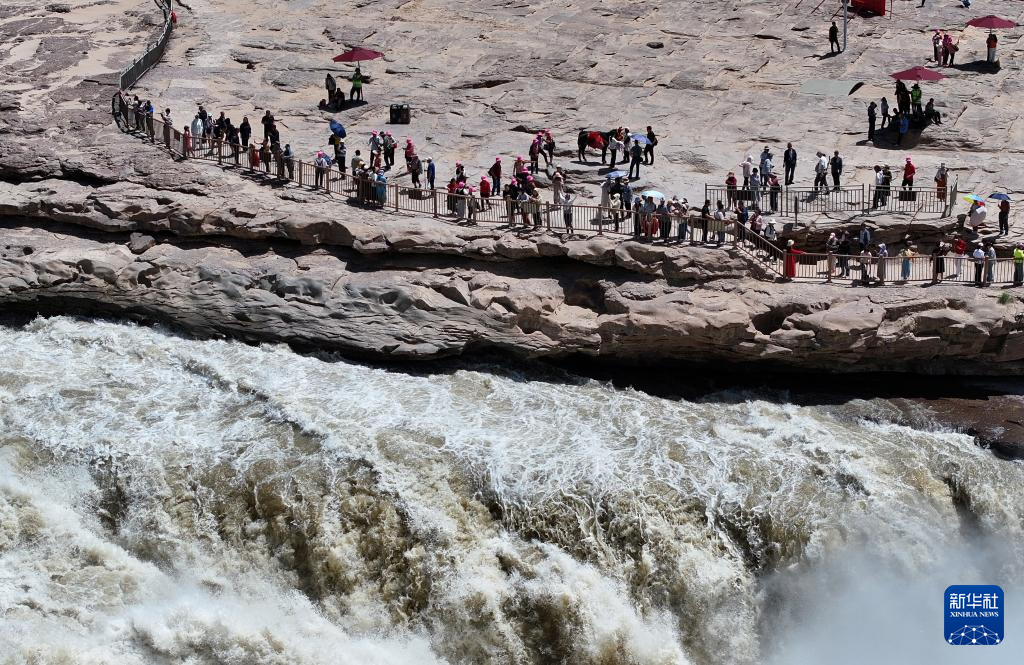 夏日时节,在位于晋陕交界处的黄河壶口瀑布景区,气势磅礴的黄河水如万马奔腾,壮美景观吸引游人驻足游览。