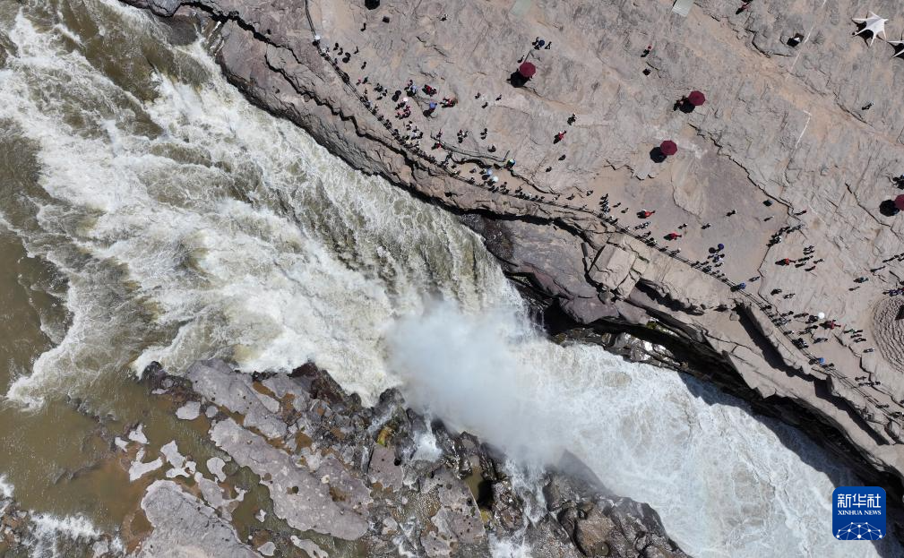 6月4日,游客在位于晋陕交界处的黄河壶口瀑布景区参观(无人机照片)。