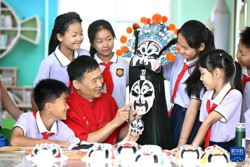 6月10日,在石家庄市裕华西路小学,张建认向学生展示京剧脸谱。