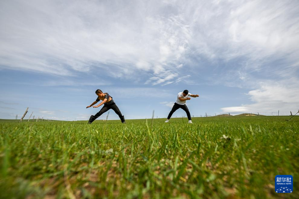 6月12日,敖日布桑与儿子德格金练习搏克手入场时的鹰步。