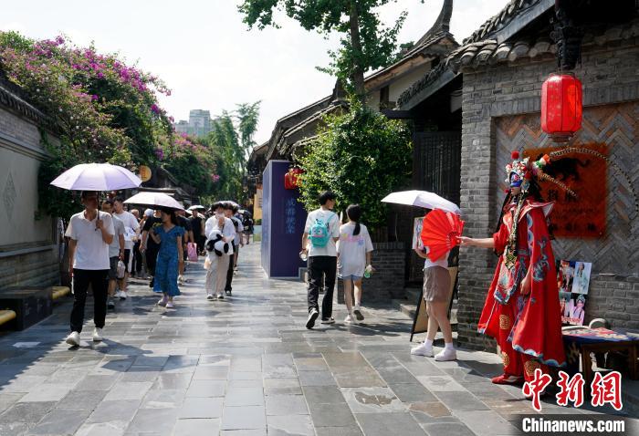 成都市气象台7月13日10时00分发布高温橙色预警信号:预计今日白天成都市武侯区、锦江区、青羊区、成华区、金牛区、青白江区、高新南区和高新西区的所有镇(街道)最高气温将升至35℃以上,东部新区的大部分镇(街道)最高气温将升至38℃以上,高温时段主要出现在今日12-19时。预计未来五天高温天气持续,请注意防范高温带来的不利影响。图为游客在烈日下游览成都宽窄巷子特色街区。中新社记者安源 摄