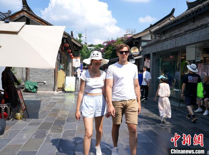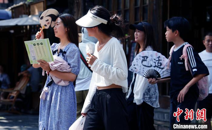 成都市气象台7月13日10时00分发布高温橙色预警信号:预计今日白天成都市武侯区、锦江区、青羊区、成华区、金牛区、青白江区、高新南区和高新西区的所有镇(街道)最高气温将升至35℃以上,东部新区的大部分镇(街道)最高气温将升至38℃以上,高温时段主要出现在今日12-19时。预计未来五天高温天气持续,请注意防范高温带来的不利影响。图为外国游客在烈日下游览成都宽窄巷子特色街区。中新社记者安源 摄