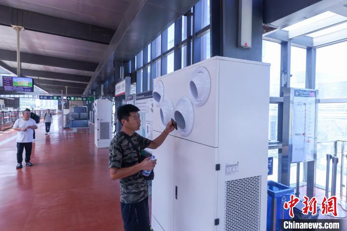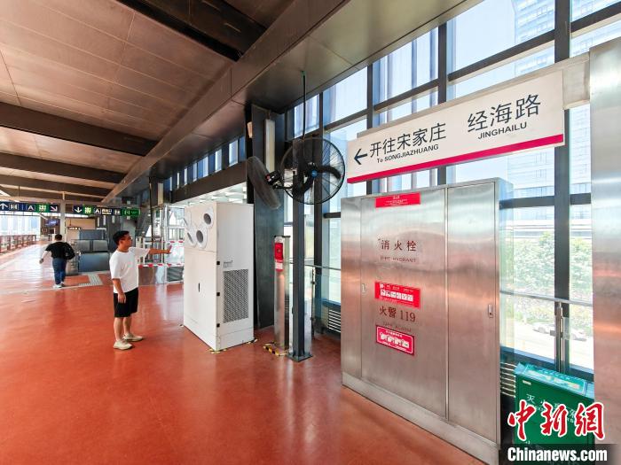 7月17日,乘客在北京地铁亦庄线经海路站冷风机前吹风。面对北京近期持续高温天气,部分地铁站启用冷风机为乘客送清凉。中新社记者 贾天勇 摄