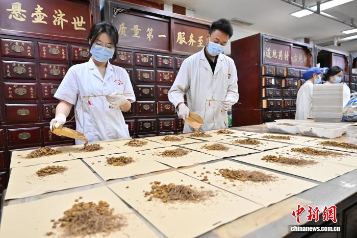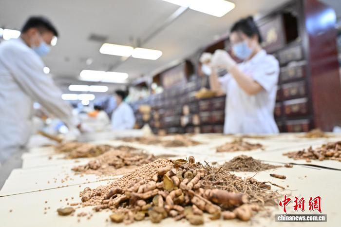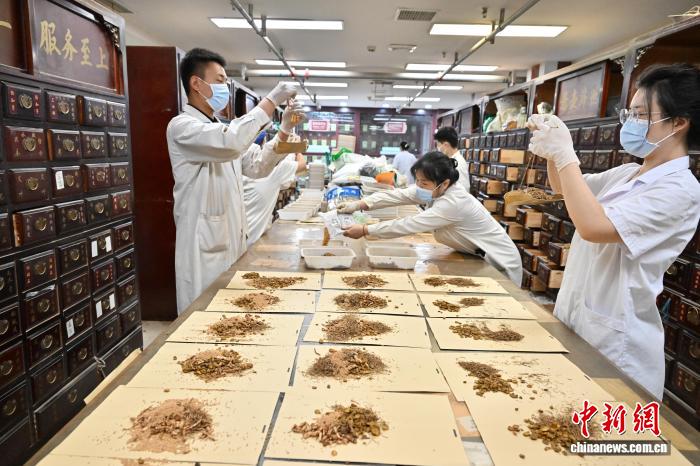 7月20日,入伏首日,河南商丘众多家长带孩子前往中医机构,通过贴敷“三伏贴”和施行“三伏灸”等中医疗法,以达到“冬病夏治”的效果。图为中医师正在调配“冬病夏治”所需中药。李恒 摄