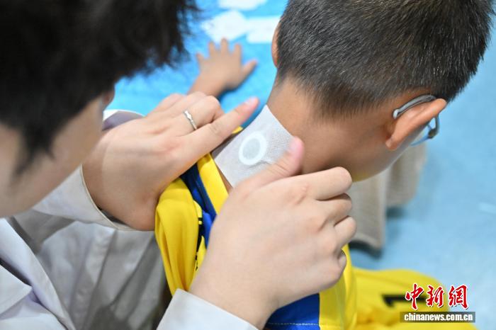 7月20日,入伏首日,河南商丘众多家长带孩子前往中医机构,通过贴敷“三伏贴”和施行“三伏灸”等中医疗法,以达到“冬病夏治”的效果。图为中医师为小朋友贴“三伏贴”。李恒 摄