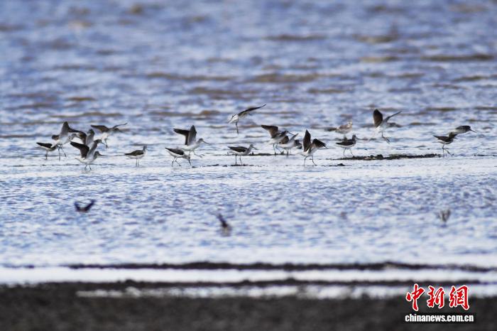 7月23日,成群青脚鹬在觅食。夏日时节,成群的黑嘴鸥、白鹭、青脚鹬等鸟类在青岛胶州湾国家级海洋公园(红岛段)滨海湿地觅食栖息、更换夏羽,在宁静的滩涂绘就了一幅美好的生态画卷。王海滨摄