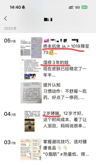 陈女士反映,该“营养师”小红书账号已经注销,但微信公众号和朋友圈仍不断更新,其中有大量服用保健品后的“健康奇迹”。记者调查发现,该“营养师”在各平台均未展示营养师资质证明。陈女士表示,她通过该“营养师”的个人介绍、营养健康讲座分享和健康群的案例,逐步相信其“营养师”专业能力。
