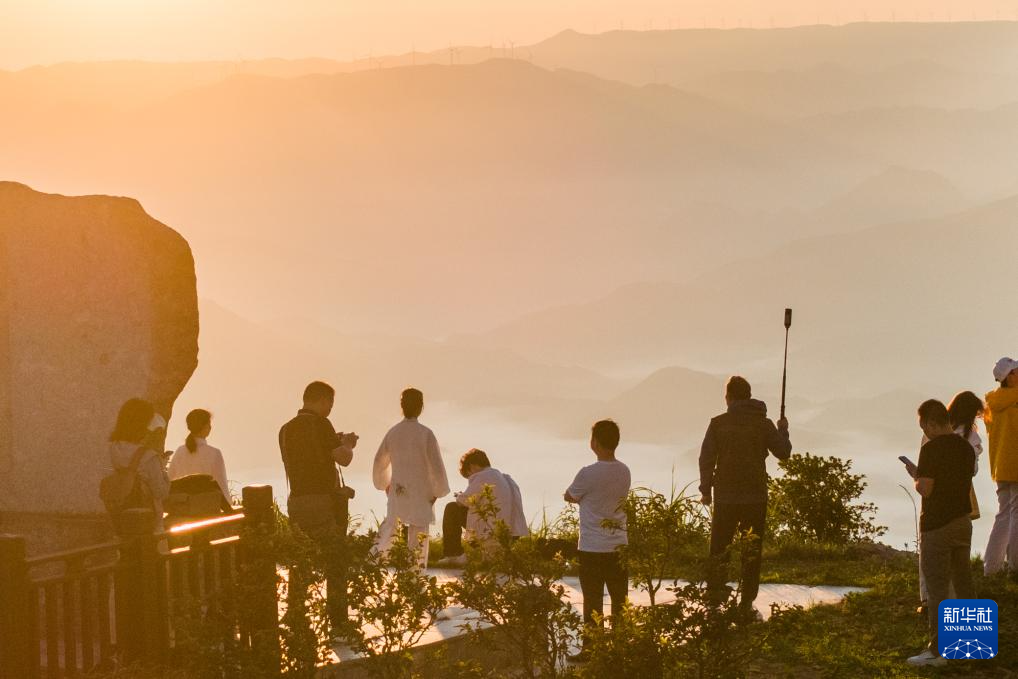 7月30日,游客在湖南怀化雪峰山国家森林公园山顶欣赏日出(无人机照片)。