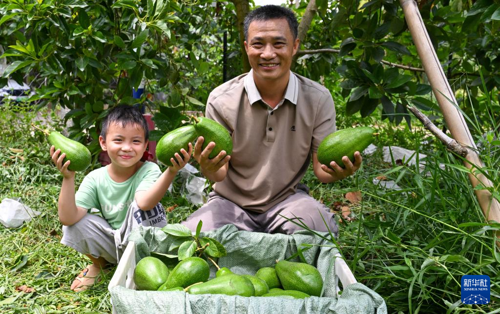 在海南省白沙黎族自治县荣邦乡一牛油果种植园,种植户展示刚采摘的牛油果(8月13日摄)。