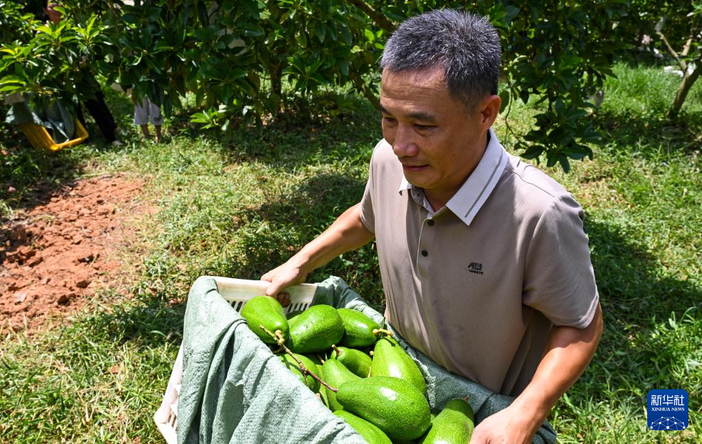在海南省白沙黎族自治县荣邦乡一牛油果种植园,种植户采摘牛油果(8月13日摄)。