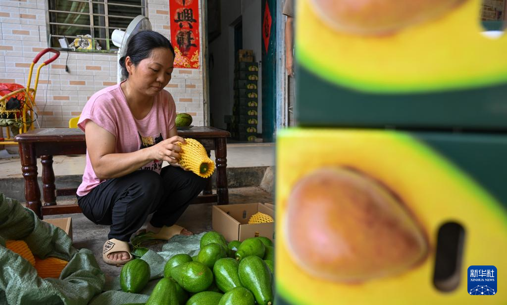 在海南省白沙黎族自治县荣邦乡一牛油果种植园附近,种植户将牛油果打包装箱(8月13日摄)。