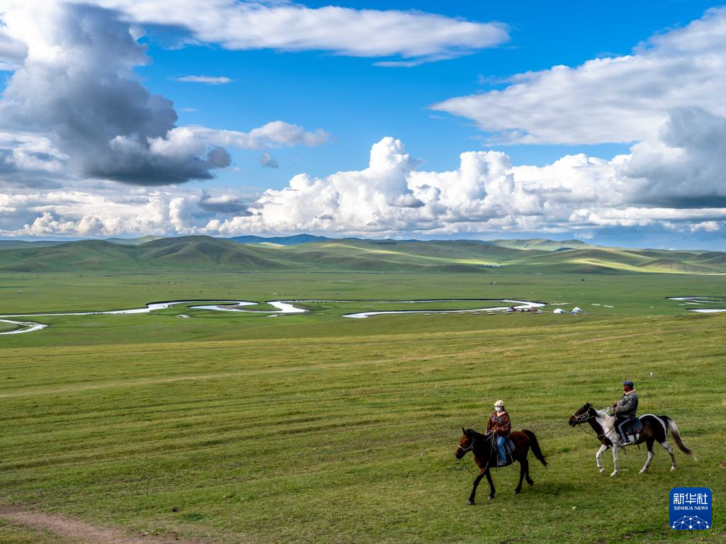 8月19日,在内蒙古呼伦贝尔市陈巴尔虎旗,人们在莫尔格勒河畔骑马。