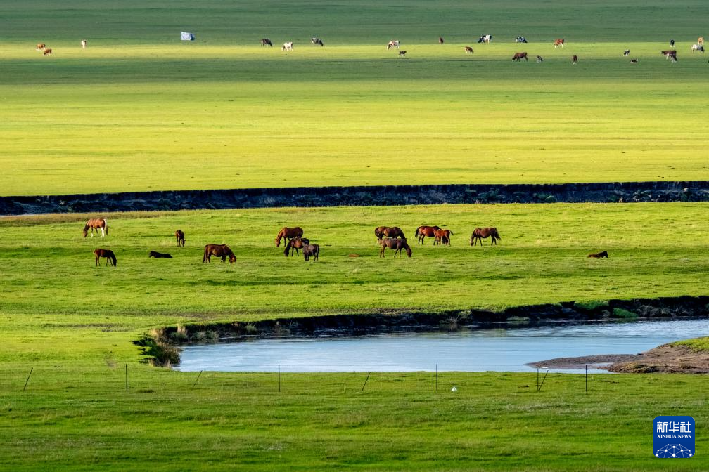 初秋时节,内蒙古呼伦贝尔大草原在阳光照耀下,黄绿交织、层次分明。位于呼伦贝尔市陈巴尔虎旗境内的莫尔格勒河蜿蜒迂回,牛羊、马匹在河畔自由徜徉,绘就草原美丽画卷。