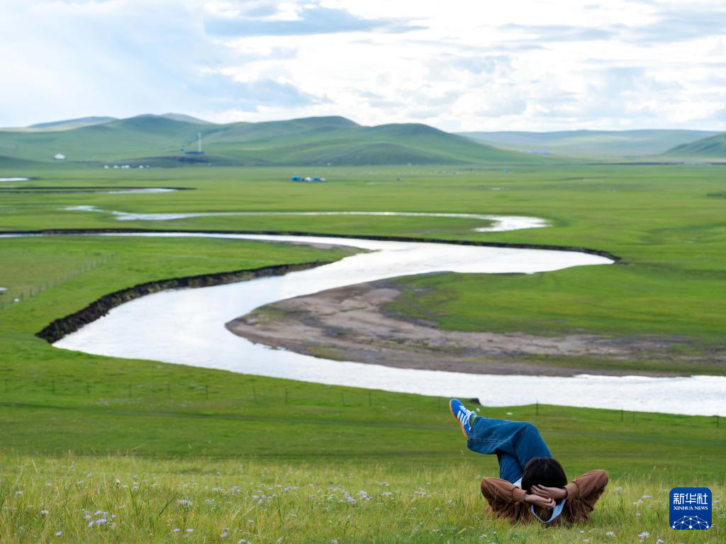 8月19日,在内蒙古呼伦贝尔市陈巴尔虎旗,游客躺在莫尔格勒河畔的草地上。