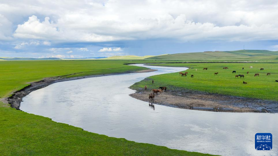 8月19日,在内蒙古呼伦贝尔市陈巴尔虎旗,马群在莫尔格勒河畔饮水(无人机照片)。