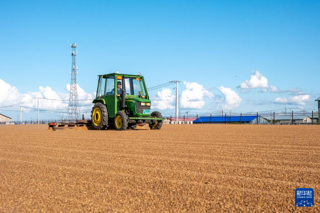 8月20日,呼伦贝尔农垦拉布大林农场的工人驾驶农机翻晒小麦。