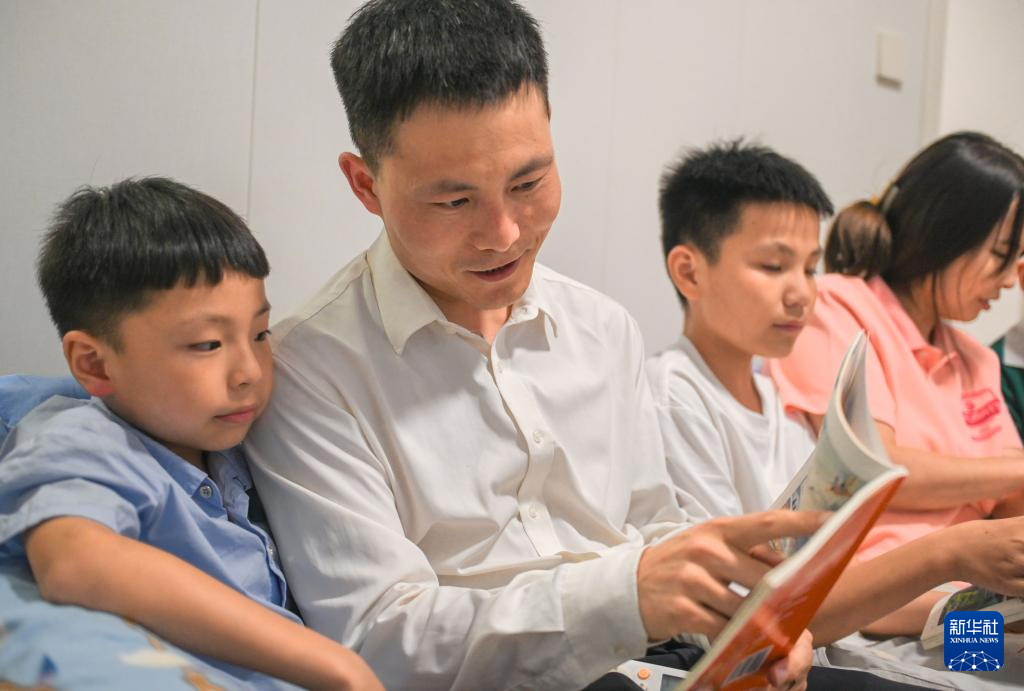 8月19日,滴滴司机韩广滨(左二)在公寓里陪儿子看画册。