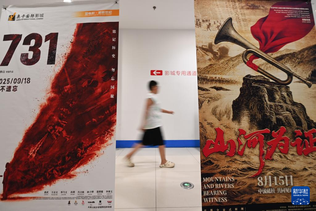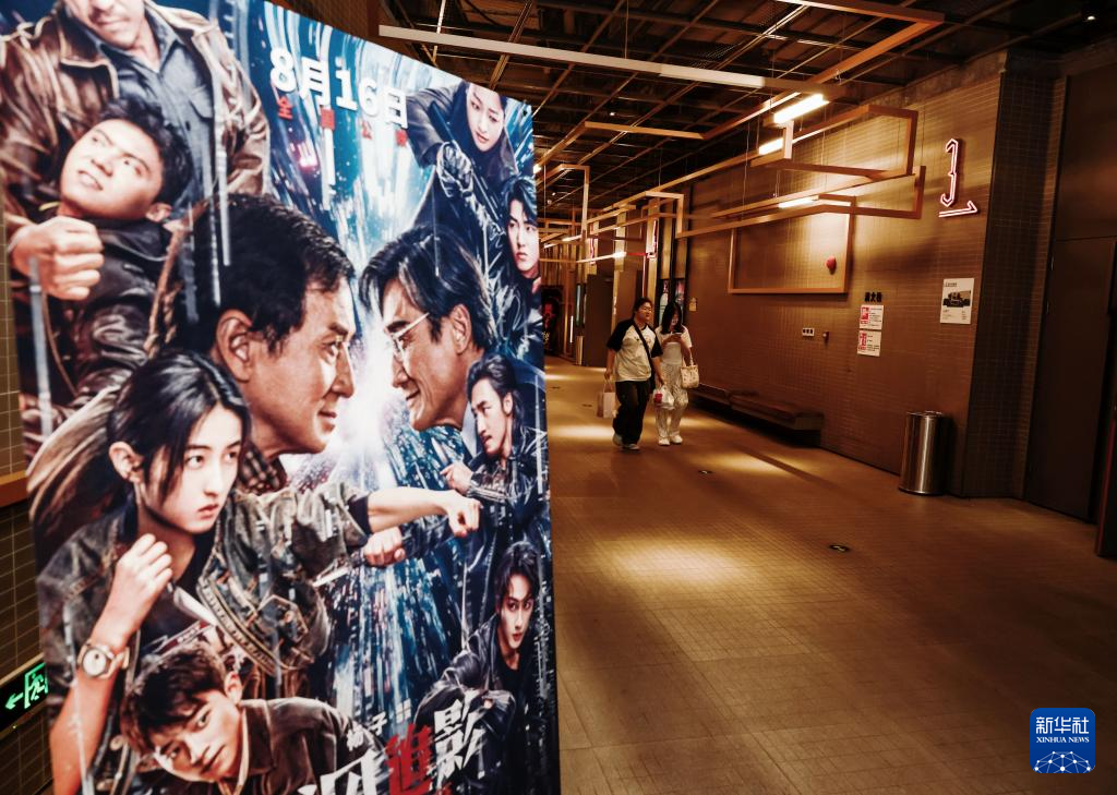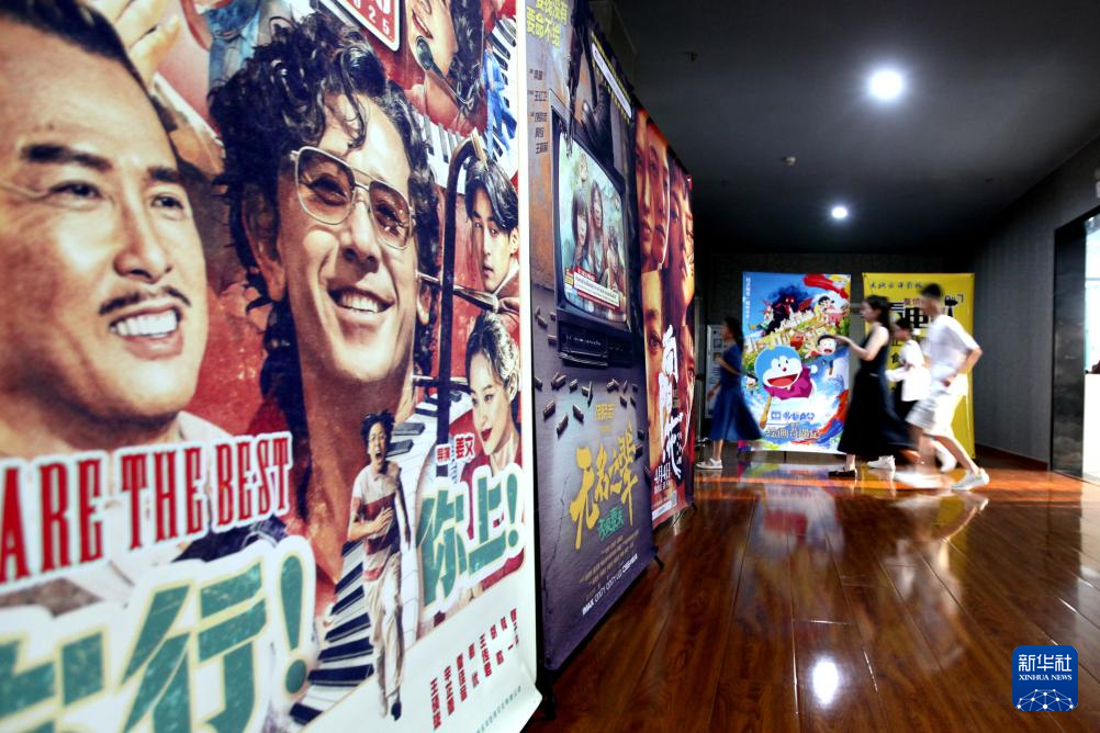 8月18日,观众在山东省临沂市平邑县一家电影院的暑期档电影宣传海报前走过。