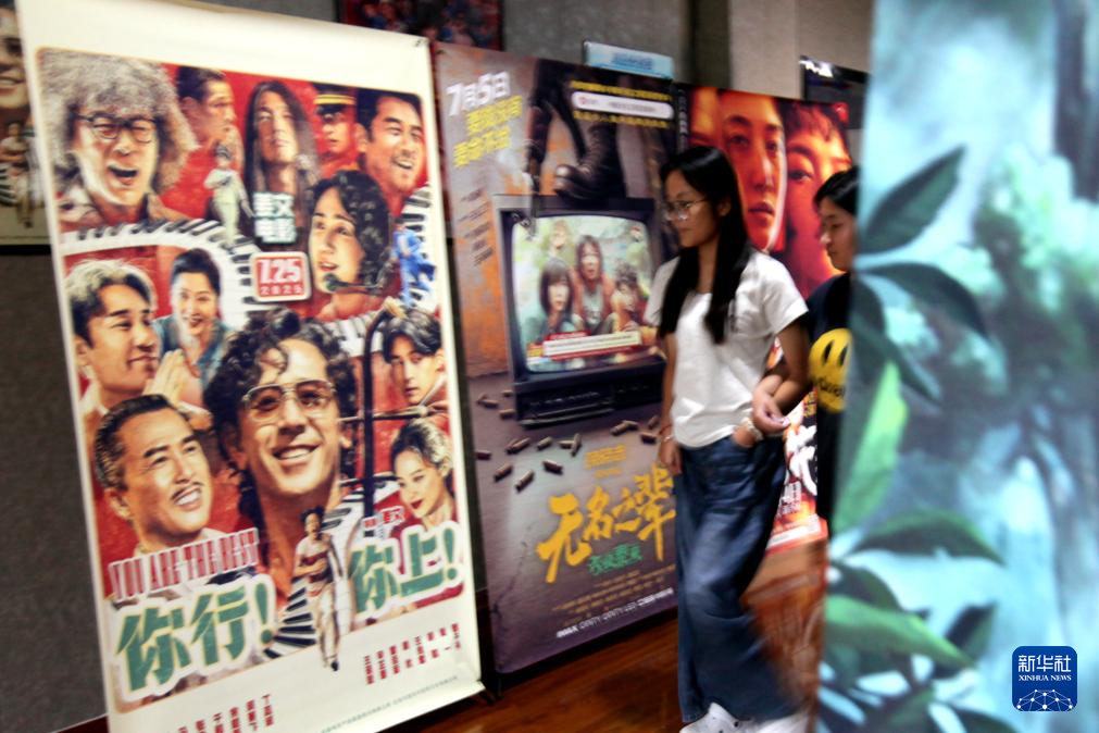 8月25日,在武汉市百丽宫影城,观众经过暑期档电影海报。