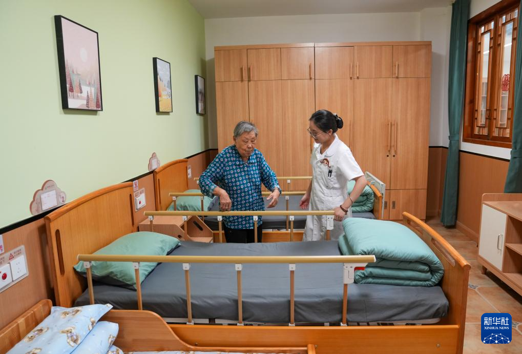 9月1日,成都市营门口街道综合为老服务中心的一位工作人员带领老人参观体验白天托养床位。