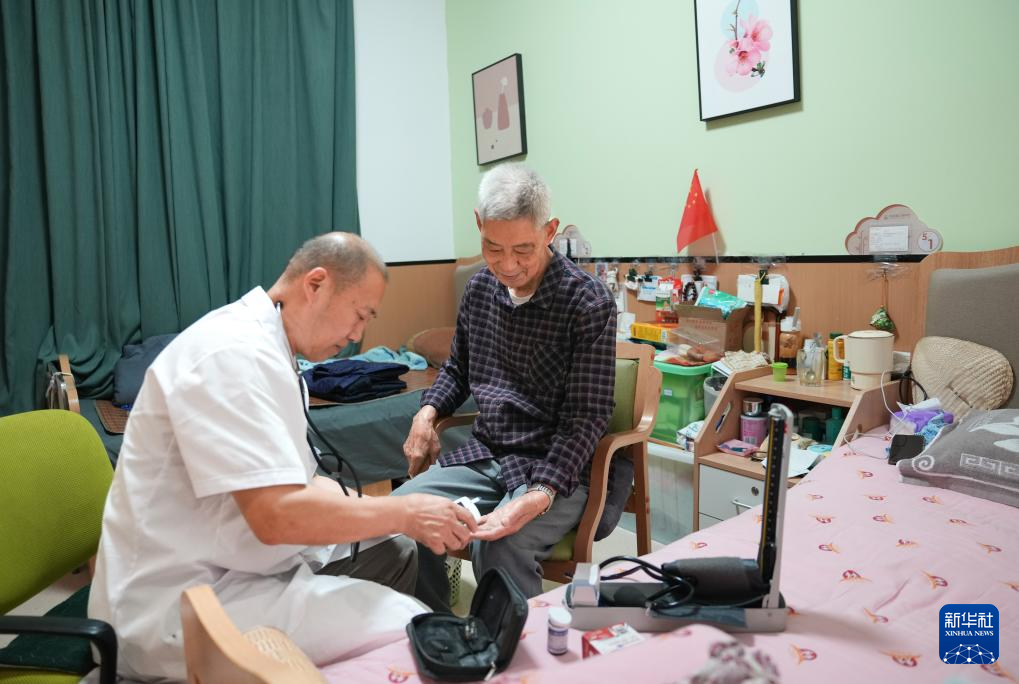 9月1日,一名医生给住在成都市营门口街道综合为老服务中心休养房间的黎肇瑞老人(右)检查身体。