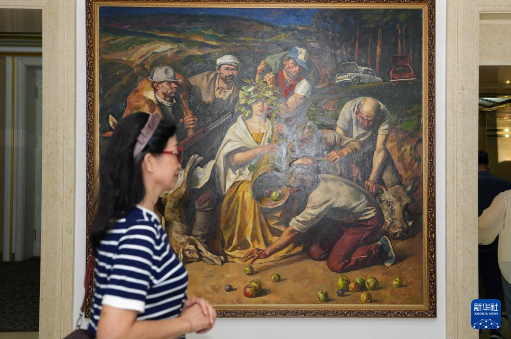 游客在位于哈尔滨市平原街的韩建民中俄油画收藏馆拍照(9月7日摄)。