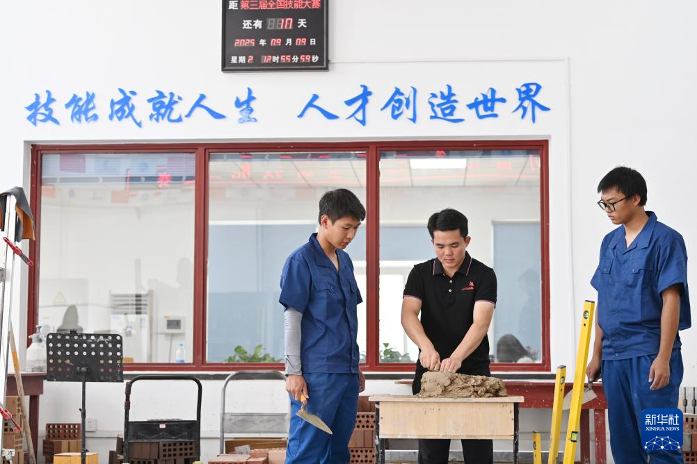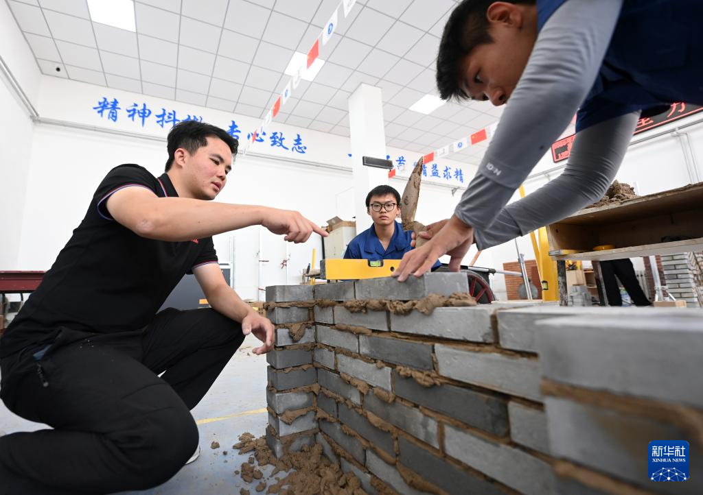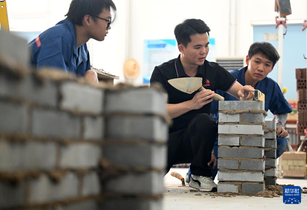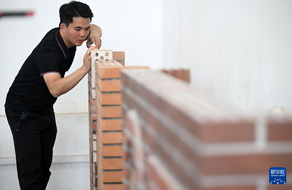 手握砖块、挥舞砌刀,伴着精准的抹灰动作……在天津铁道职业技术学院砌筑集训基地内,学校教师伍远州正给学生示范砌墙的动作要领,为带队参加第三届全国技能大赛进行最后的冲刺集训。