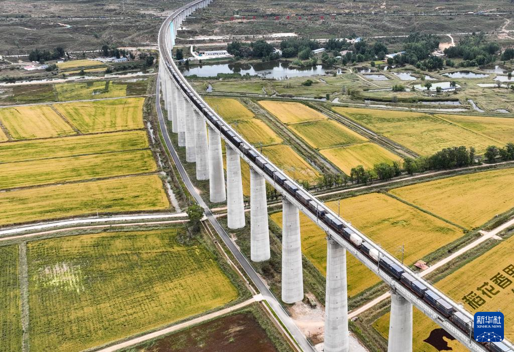 9月22日,一列火车经过内蒙古准格尔旗的稻田(无人机照片)。
