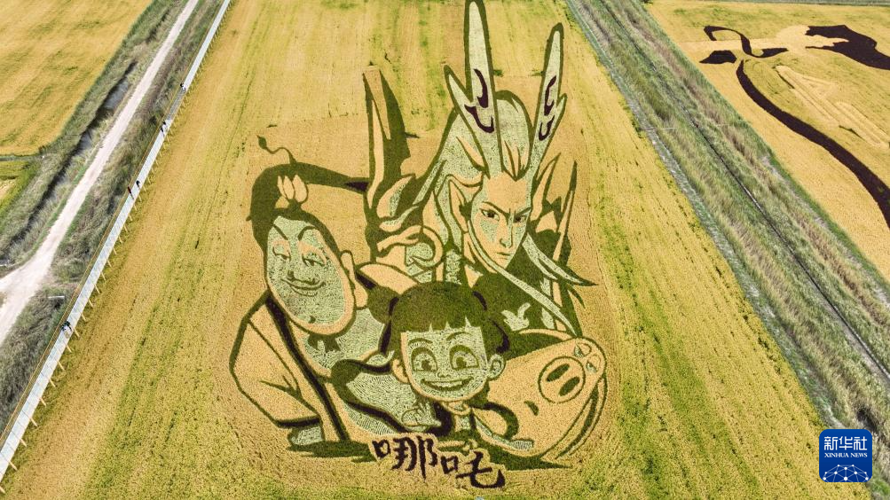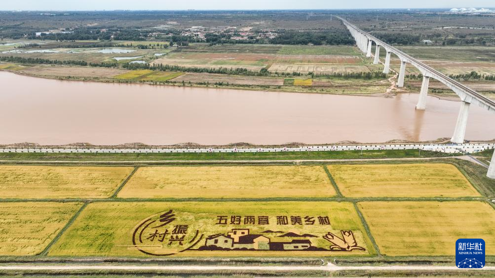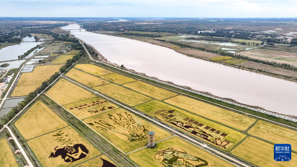 这是9月22日在内蒙古准格尔旗拍摄的黄河岸边的稻田画(无人机照片)。
