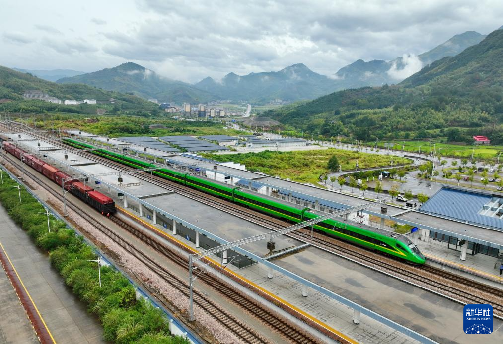 9月24日,衢宁铁路政和站停靠着“绿巨人”新型动车(无人机照片)。